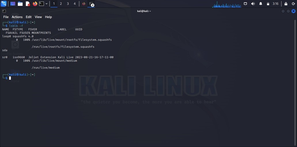I believe the exploration of the Kali Linux file system using the df and lsblk commands offers insights into the filesystem types associated with mounted storage devices and partitions. These two methods I have used provide some glimpse into the storage architecture.